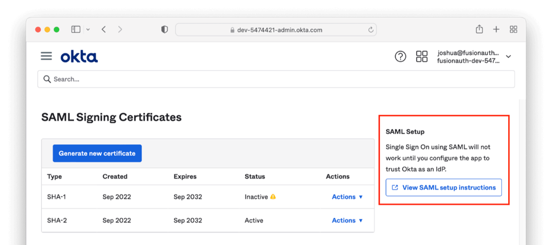 - Click the "View SAML setup instructions" under the "Sign On" tab. This will open a new window.