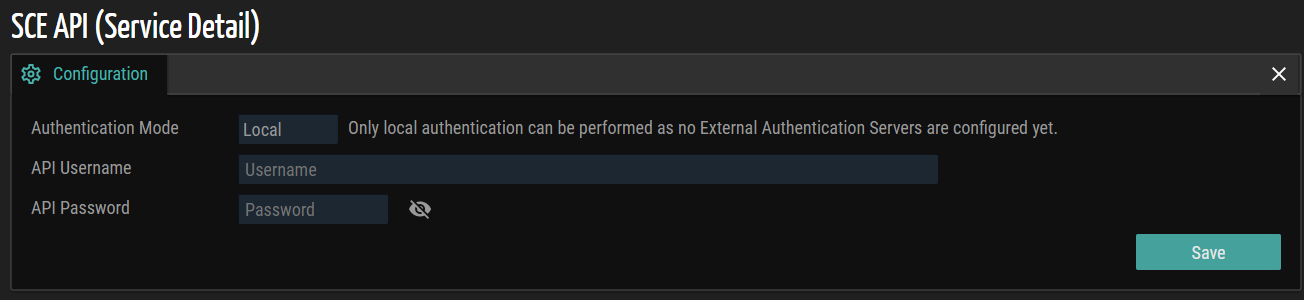 Enter the API username and password in the corresponding fields. Authentication mode is set to Local by default.